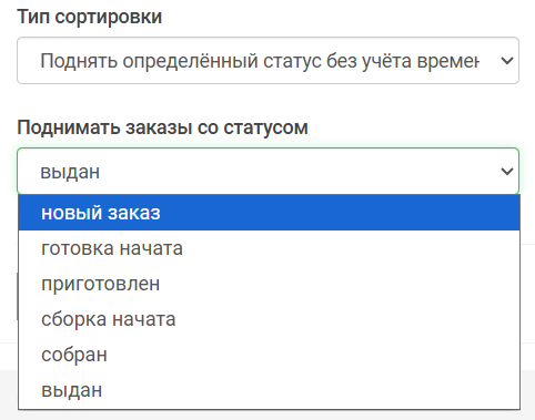 Сортировка по определенному статусу - заказы с выбранным статусом отображаются перед всеми остальными заказами. Статус выбирается в всплывающем списке «Поднимать заказы со статусом».