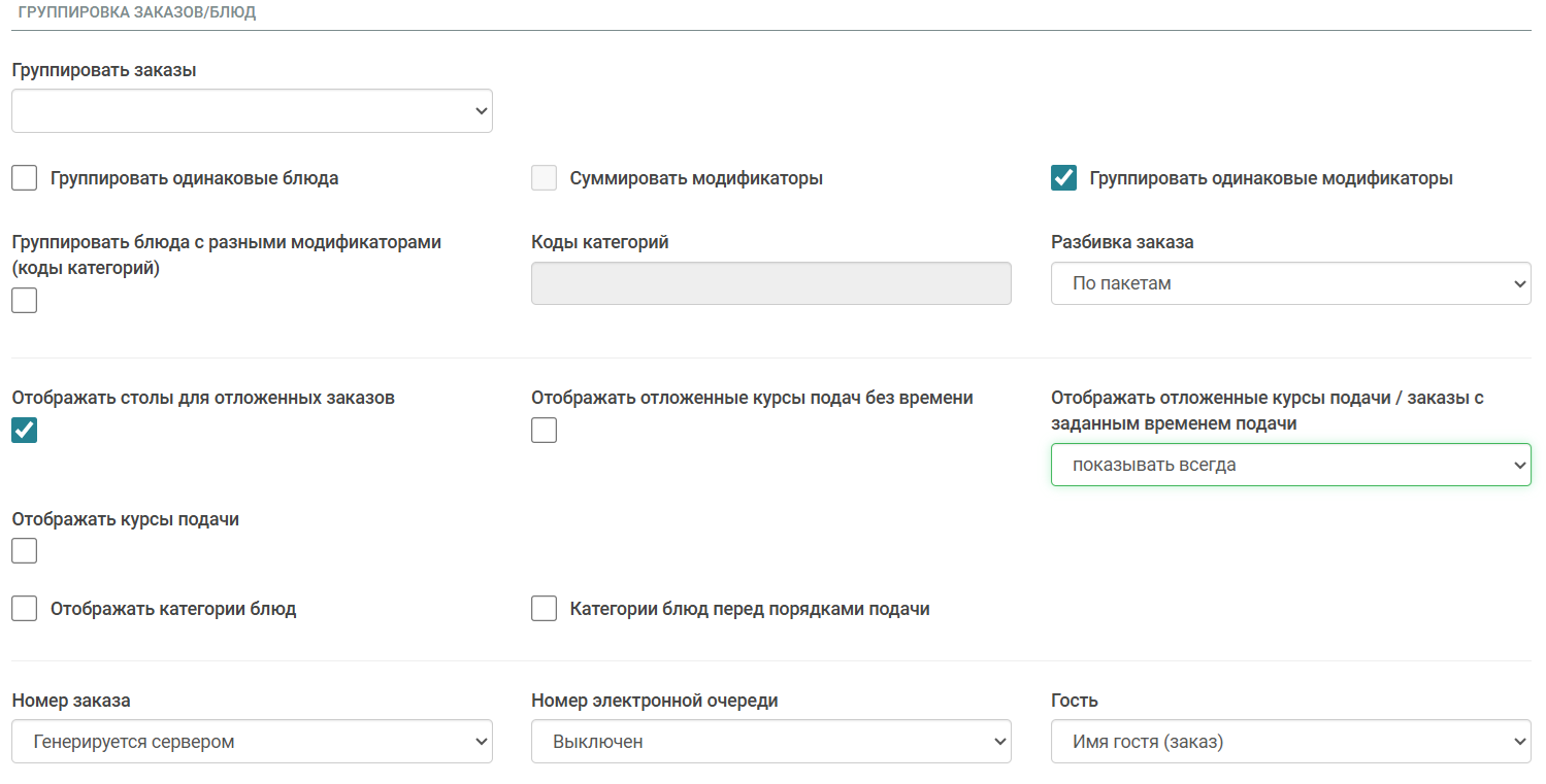 Выключен - если группировка отключена, то заказы будут отображаться на экране по мере их создания (добавление блюд в уже открытый заказ отобразится как новый заказ).