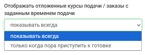 Только когда пора приступать к готовке - блюда с отложенными порядками подачи и заказы с заданным временем подачи будут отображаться на экране после того как пакет будет переведен в активный статус. При выборе данной настройки откроется дополнительное поле Отображать заранее, за. Введите желаемое значение: