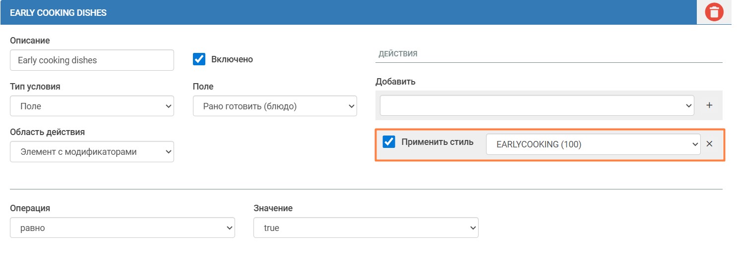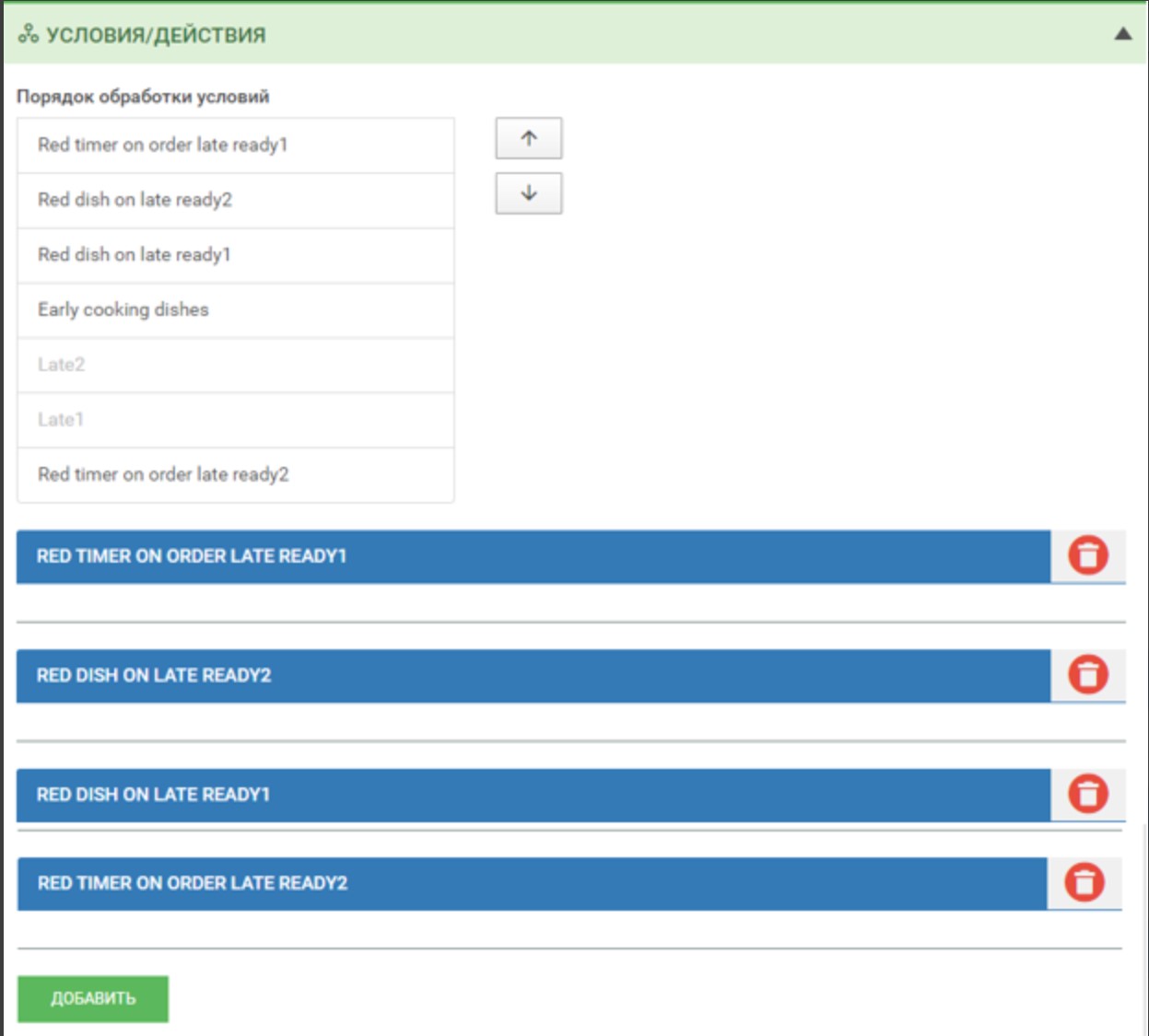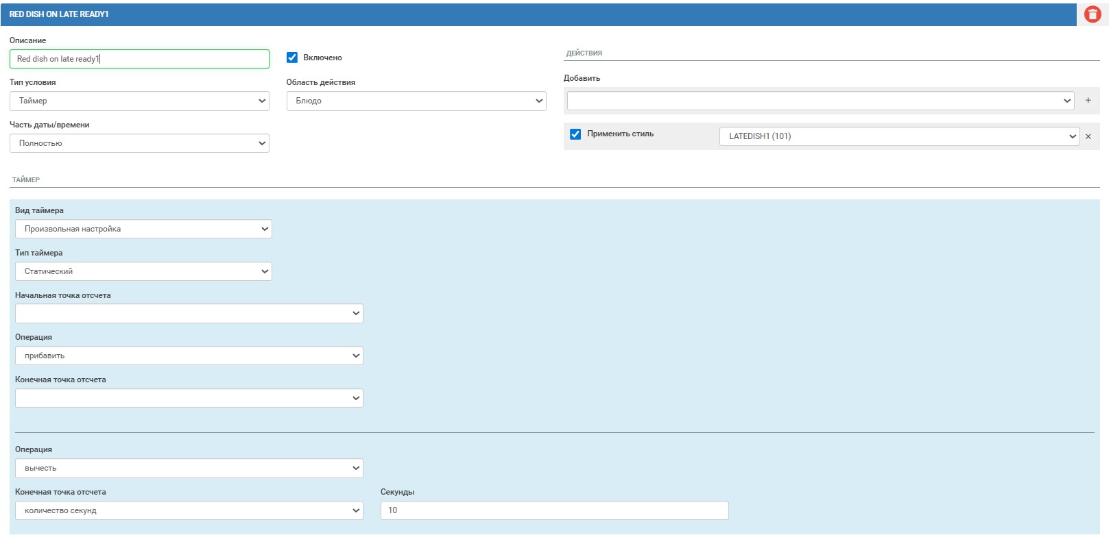 - Red dish on late ready 1 — отображать строку с блюдом на оранжевом фоне за N секунд до теоретического времени окончания готовки. Время задается в настройках условия.