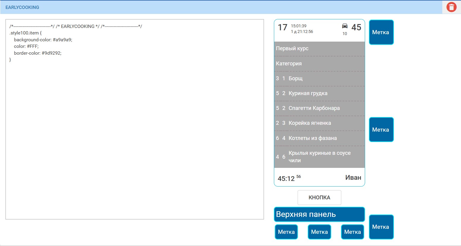 - Early cooking dishes — отображать строку с блюдом на сером фоне, если блюдо рано готовить (при использовании порядков подачи «Отложить готовку» или «Черновик»).