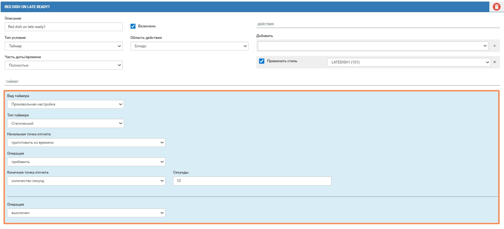 - Red timer on order late ready 1 — отображать таймер на оранжевом фоне за N секунд до теоретического времени окончания готовки заказа. Время задается в настройках условия.