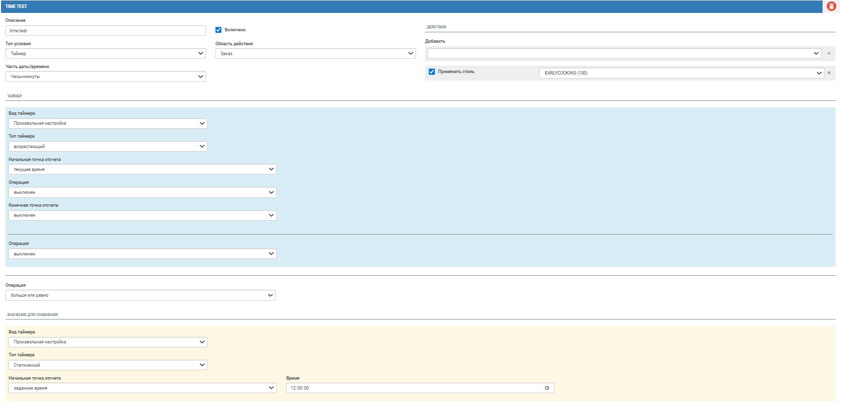 Можно сделать условие, срабатывающее в определённый период времени для определённых блюд/заказов. Например, каждый день во время ланча, с 12:00 до 16:00, заказы, которые вообще не требуют приготовления или готовятся быстро, выделять отдельным цветом.- Тип условия — таймер