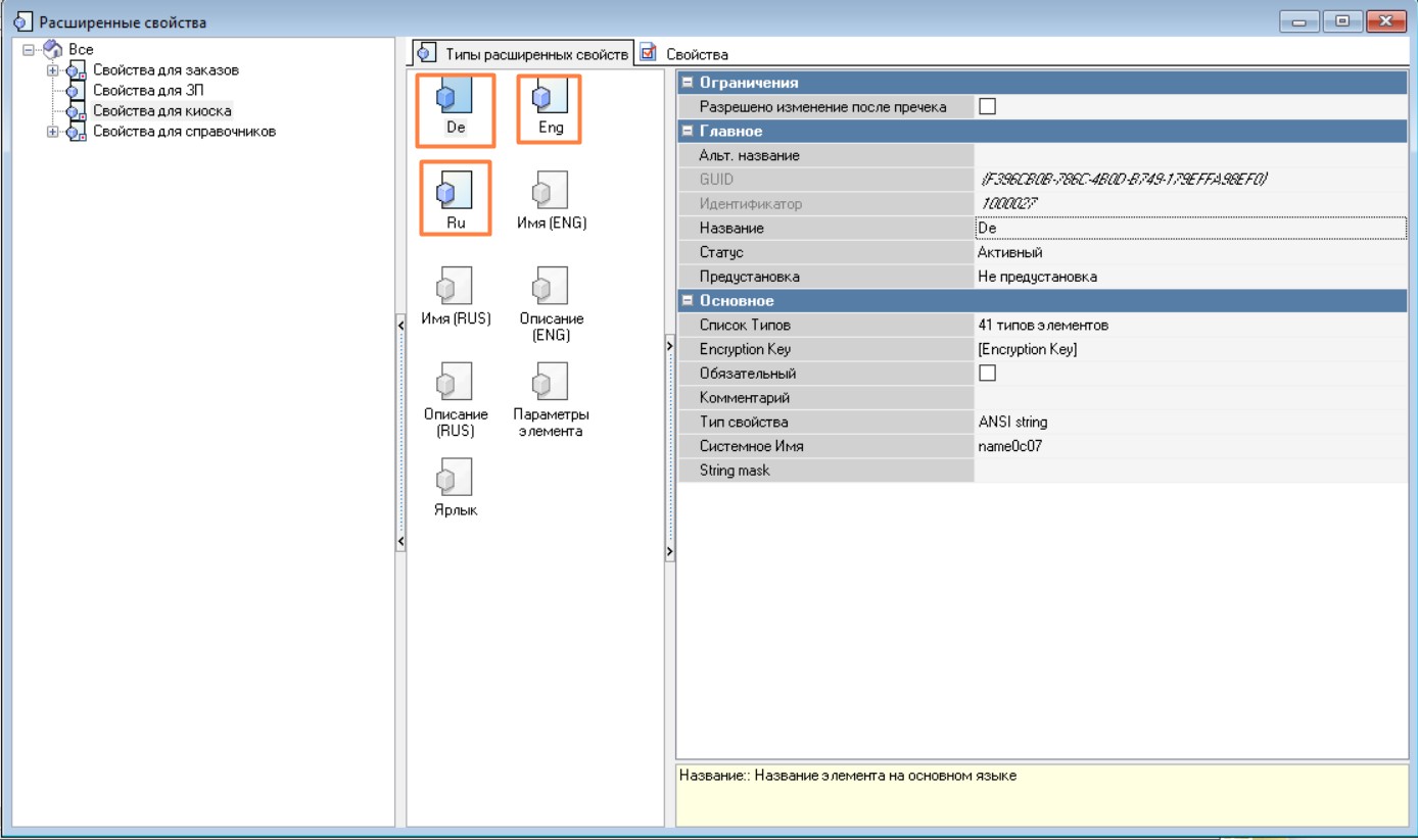 В справочнике Настройки > Настройка > Расширенные свойства создайте необходимое количество типов расширенных свойств для разных языков.
