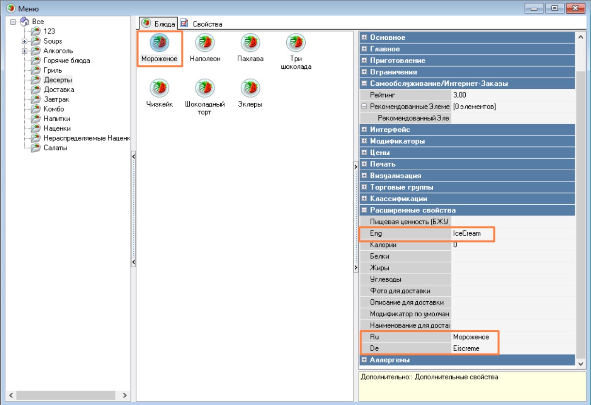 В справочнике меню у блюда задайте соответствующим расширенным свойствам название блюд на альтернативном языке.