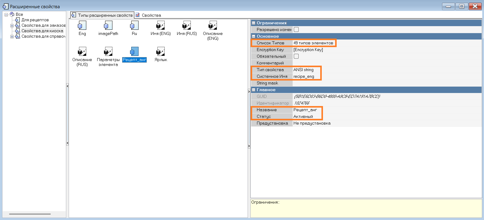 В справочнике Настройки > Настройка > Расширенные свойства создайте необходимое количество типов расширенных свойств для рецептов на разных языках.