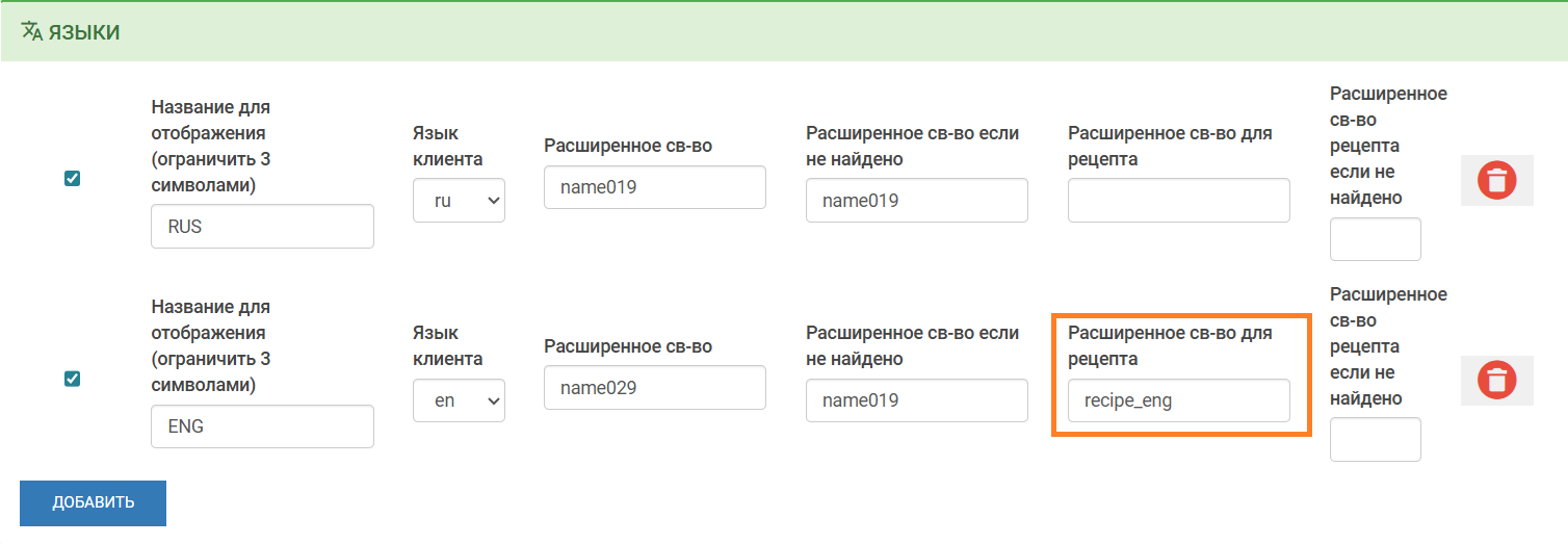 В настройках профиля KDS PRO в разделе Языки впишите расширенное свойство в строку Расширенное св-во для рецепта у соответствующего языка.
