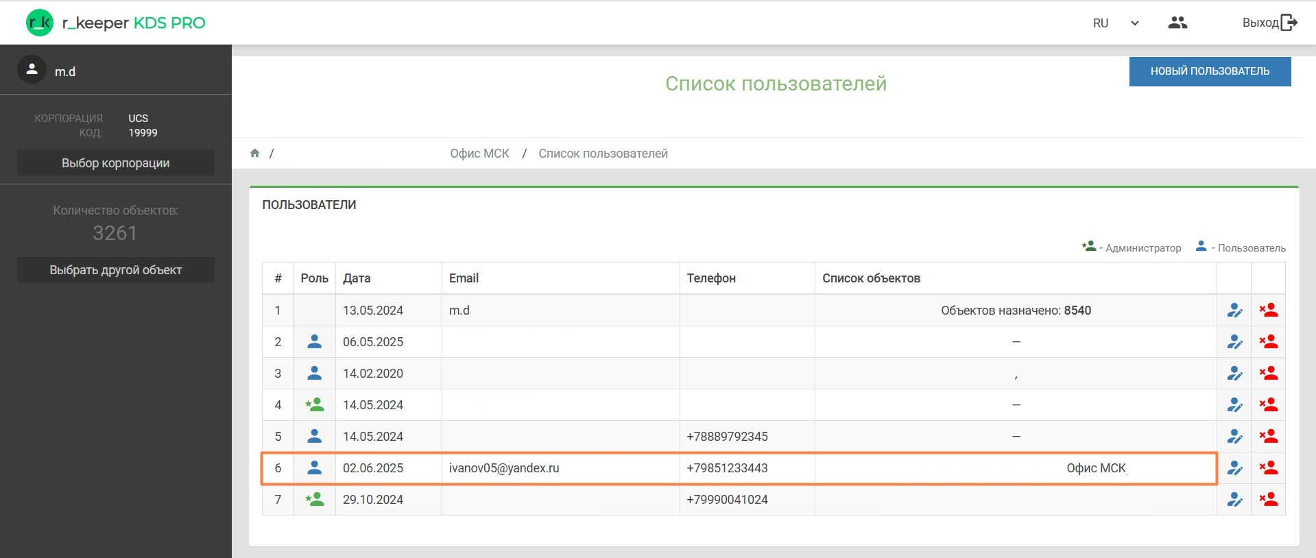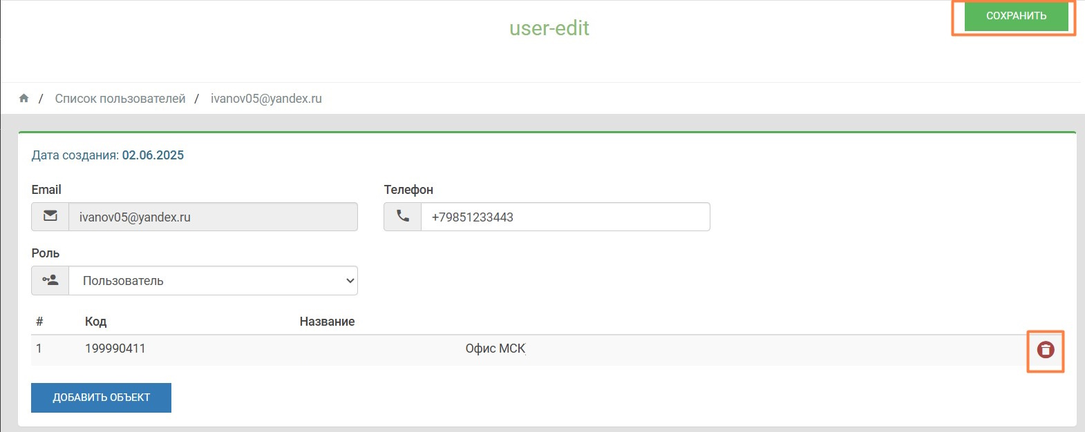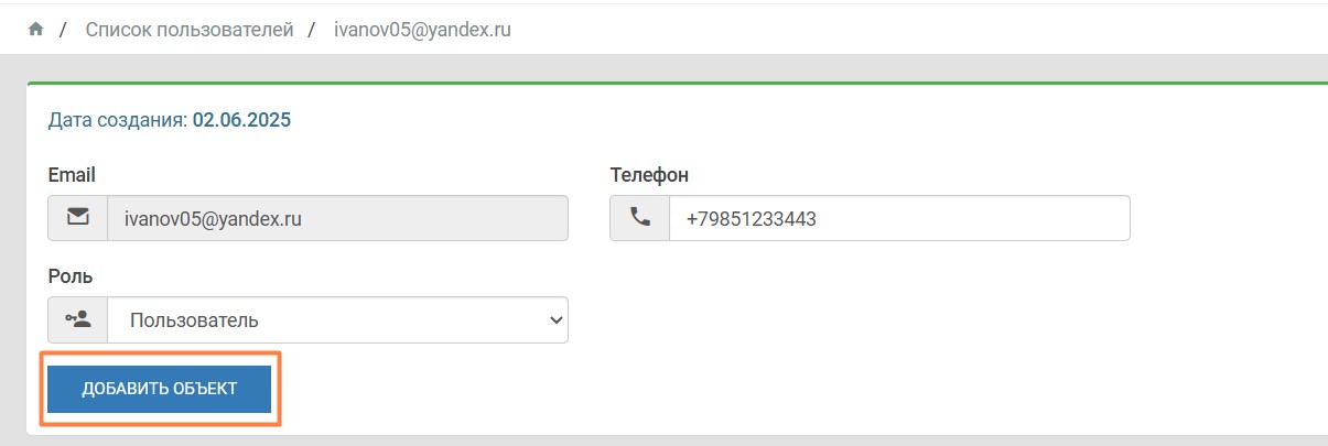В списке пользователей нажмите кнопку «Новый пользователь». После этого откроется окно для ввода нового пользователя. Email - электронный адрес пользователя (обязательное поле для заполнения), на указанный адрес будет отправлен пароль для входа в Личный кабинет. Телефон - номер телефона пользователя (необязательное поле для заполнения). После заполнения полей нажмите кнопку «Создать». Далее необходимо назначить объекты для управления этим пользователем. Для этого нажмите на кнопку В открывшемся окне нажмите на кнопку «Добавить объект» . В списке объектов выберите объект/объекты, с которыми может работать пользователь. После выбора объектов нажмите на кнопку «Добавить выбранные». Сохраните изменения нажатием кнопки «Сохранить», а для отмены кнопку . Созданный новый пользователь отобразится в списке пользователей. Пароль для входа в Личный кабинет будет отправлен на указанный адрес.