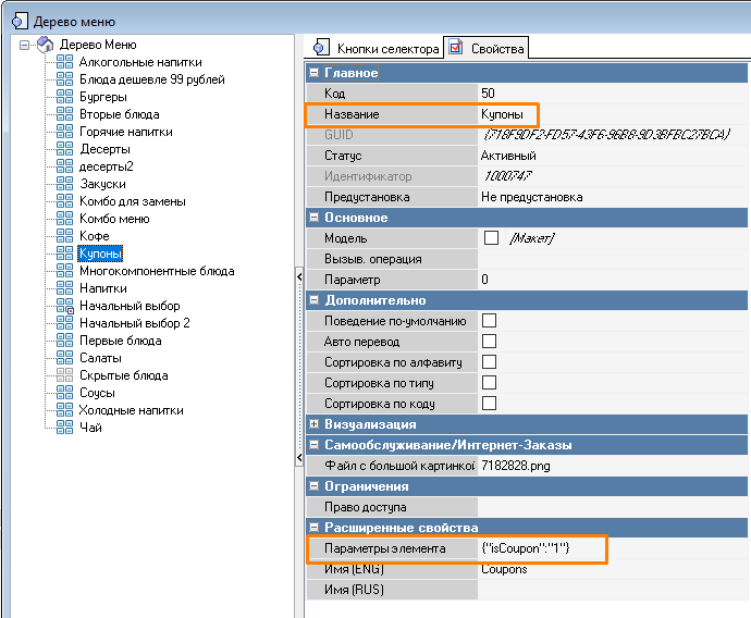 Блюдо-купон не является блюдом как таковым, а выполняет роль «контейнера», через который осуществляется переход к клавиатуре для набора кода блюда, указанного в купоне у гостя. - В дереве меню создайте страницу селектора Купоны. В свойствах группы укажите название, статус и расширенному свойству itemParams присвойте значение {"isCoupon":"1"}. Группа Купоны добавляется в селектор Начальный выбор (или любой другой по замыслу маркетологов).