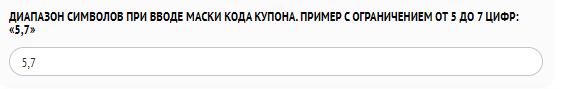 - в параметре ДИАПАЗОН СИМВОЛОВ ПРИ ВВОДЕ МАСКИ КОДА укажите количества цифр значения кода купона. Пример с ограничением от 5 до 7 цифр «5,7». Т.е. указывается количество вводимых символов. Ввести больше символов, чем задано в маске не получится. Если в коде блюда меньше цифр, чем задано в маске (см. ниже), то перед цифрами «Кода» блюда добавляются нули.