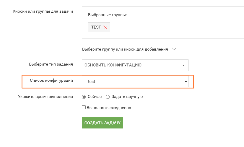При выборе задачи «Обновить конфигурацию» дополнительно необходимо выбрать конфигурацию из списка.
