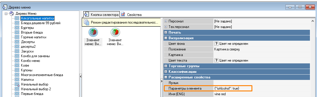 Для работы с алкоголем на киоске отметьте блюда, при выборе которых у гостей должно запрашиваться подтверждение возраста. Для этого в свойствах блюда в расширенном свойстве itemParams впишите значение {"isAlcohol": true}.
