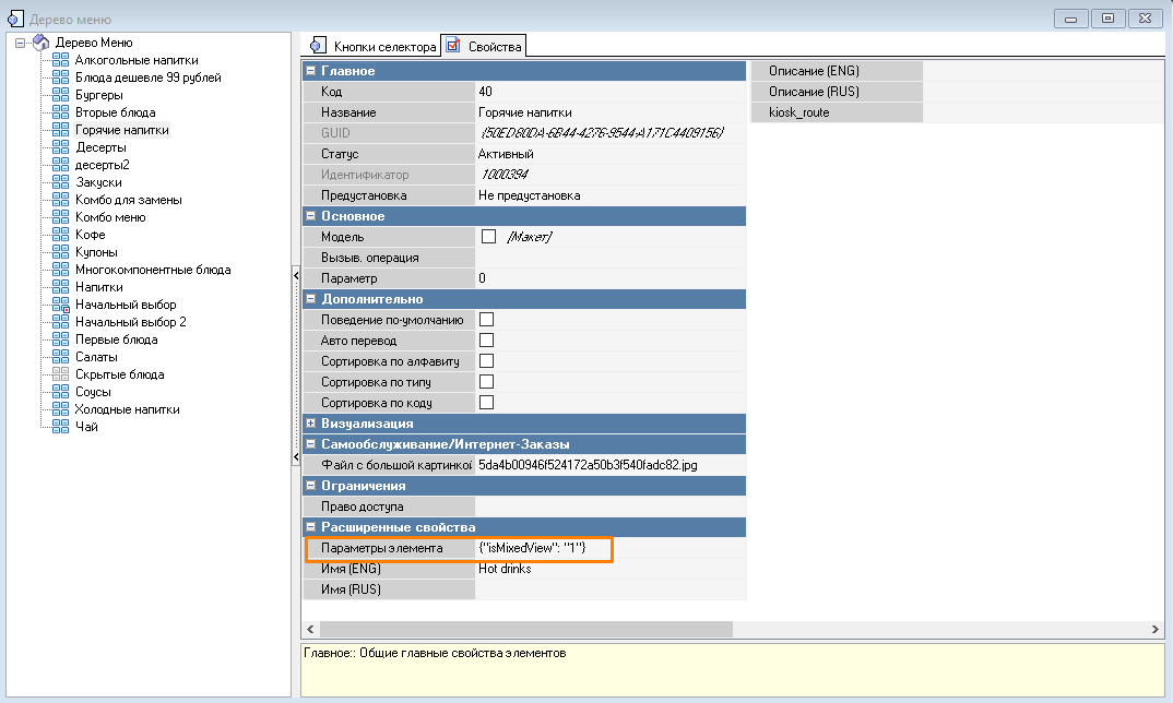 Для отображения в меню селекторов третьего уровня и выше, а также для отображения в одном селекторе одновременно подселекторов и блюд в свойствах селектора верхнего (первого) уровня расширенному свойству Параметры элемента присвойте значение {"isMixedView": "1"}