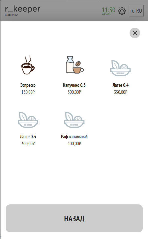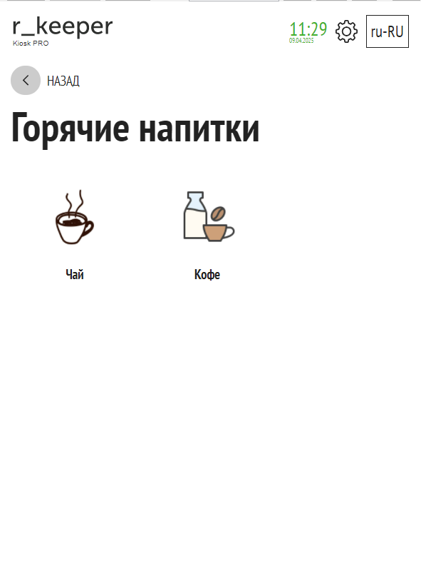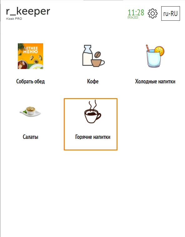 Например, страница селектора «Горячие напитки» содержит группы страниц селектора: «Кофе», «Чай». В свою очередь группа «Кофе» содержит подгруппы страниц селектора, например: «Капучино», «Латте», «Американо» — в этих страницах селектора уже находятся блюда: