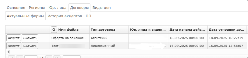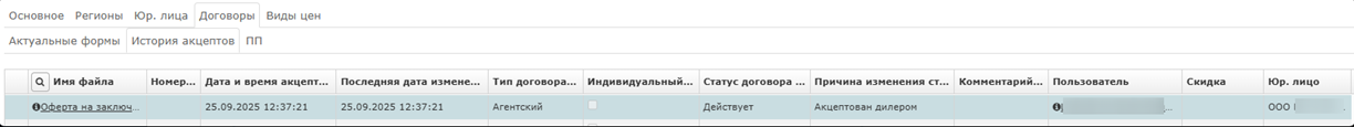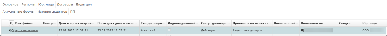- Также после акцепта во вкладке Договоры — История акцептов появится информация о факте акцепта: