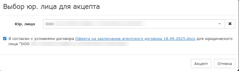 - Для Агентского договора акцепт производится только от одного юр.лица, на которое планируется получение выплаты.
