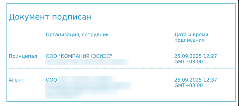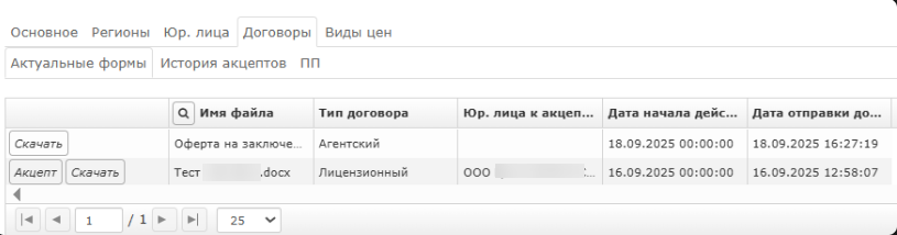 Также во вкладке Юр. лица, в конце строки с информацией о юридическом лице будет отображаться информация об акцепте: