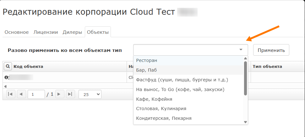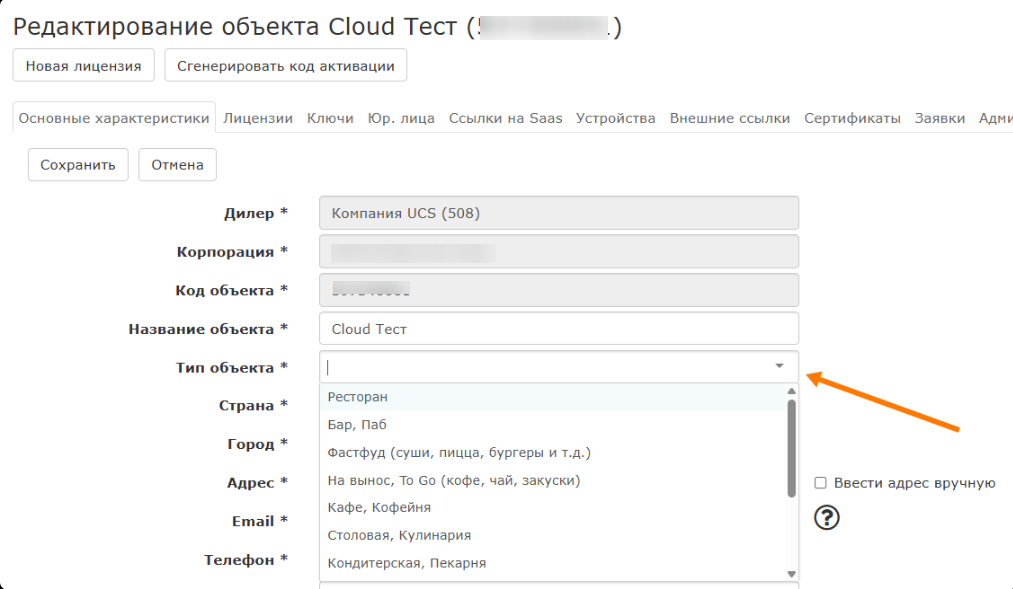В нем можно выбрать тип объекта из существующих: кафе, ресторан, столовая и т.д.