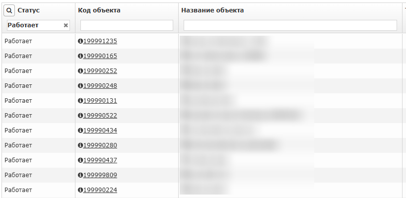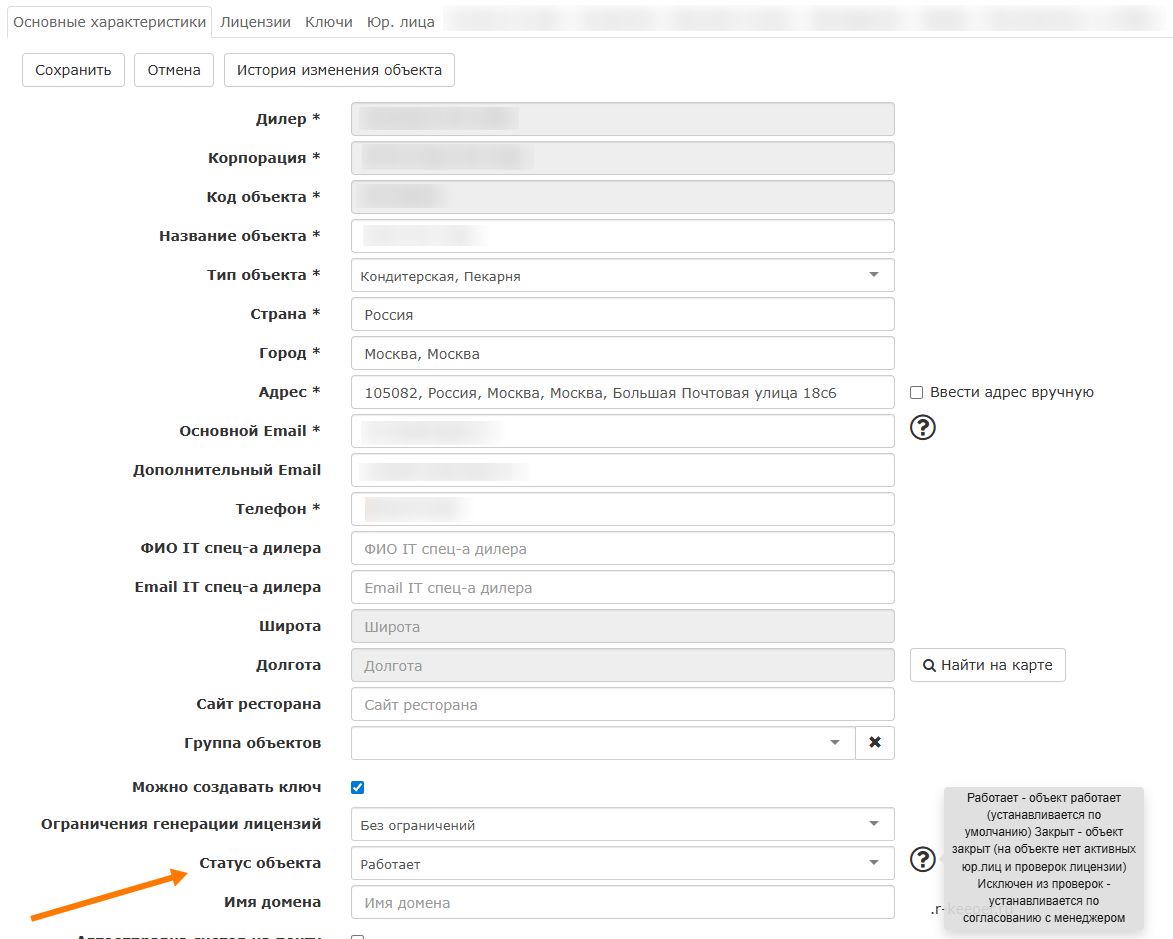 - Закрыт — объект закрыт (на объекте нет активных юр.лиц и проверок лицензий).