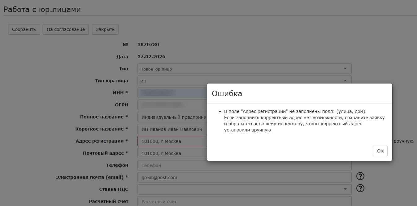 Если данные не будут заполнены, при отправке заявки возникнет ошибка с указанием, какие атрибуты адреса должны быть заполнены.