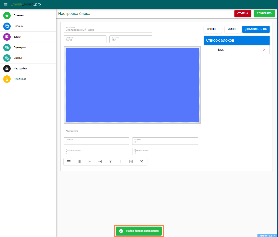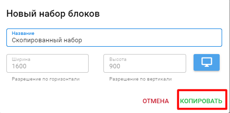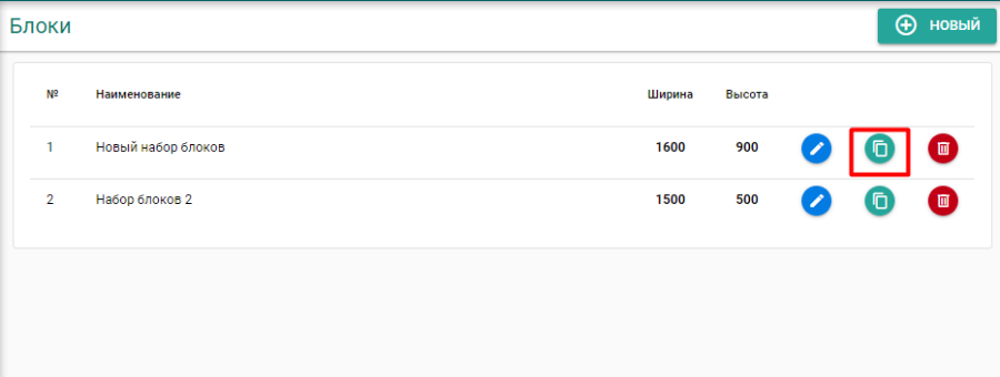 Для создания копии набора блоков в списке блоков нажмите кнопку «Копировать». Откроется окно «Новый набор блоков». Введите наименование в поле «Название». Поля «Ширина» и «Высота» недоступны для редактирования. Нажмите кнопку «Копировать» для создании нового блока. Для отказа нажмите кнопку «Отмена». Далее откроется окно «Набор блоков» и системой будет выдано сообщение «Набор блоков скопирован». Далее можно отредактировать блоки.