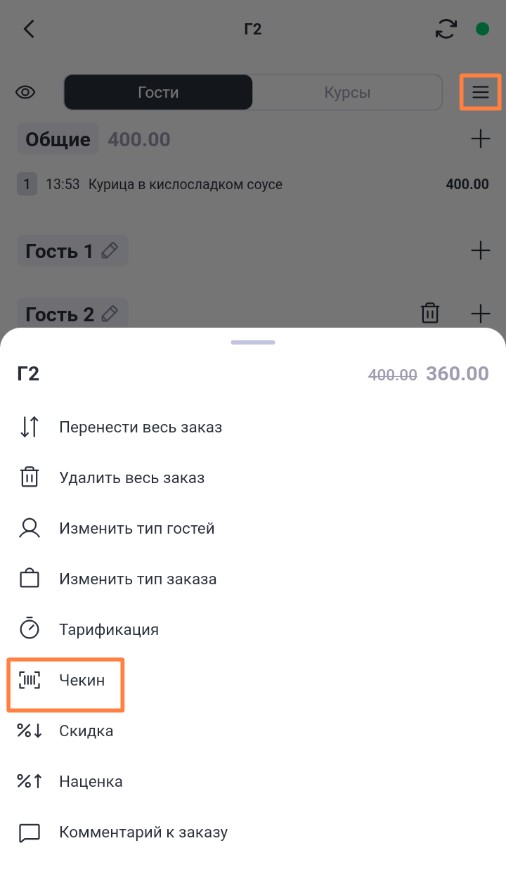 Операция Чекин позволяет добавить в заказ карту лояльности гостя для назначения скидки по карте.
