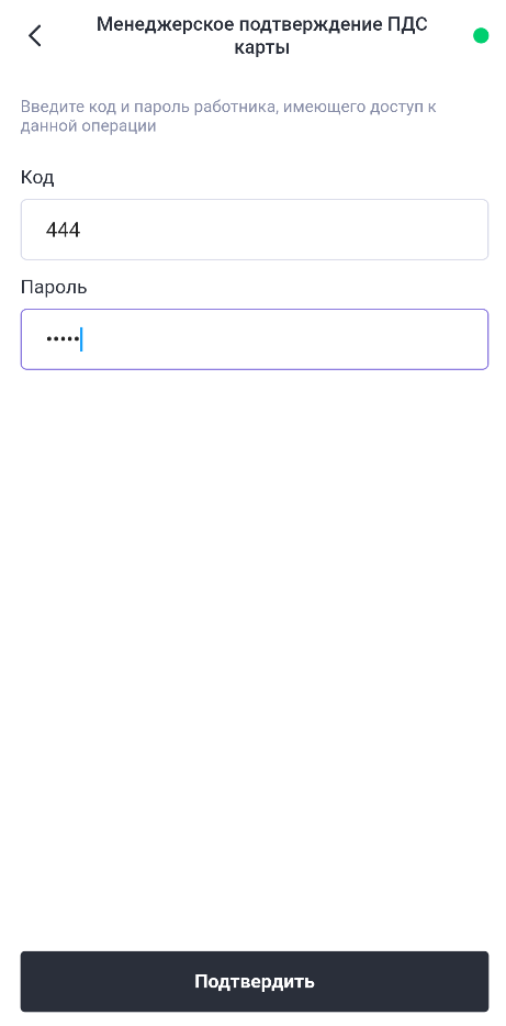 ВыберитеЧекиниз меню операций. Если у работника нет права Менеджерское подтверждение для ПДС, после операции Чекин в списке операций заказа и чтения карты, откроется окно для ввода кода и пароля работника с этим правом.