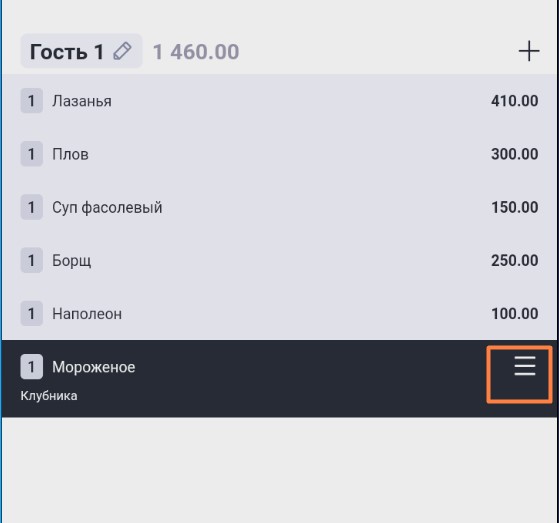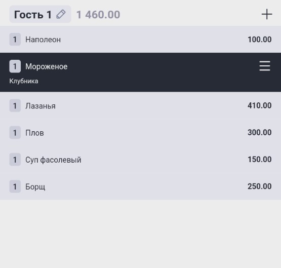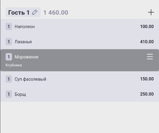 Чтобы изменить местоположения блюда, отметьте его в заказе и удерживая строку переместите ее нужное место.