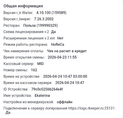 - Информация о ресторане, кассовом сервере, смене