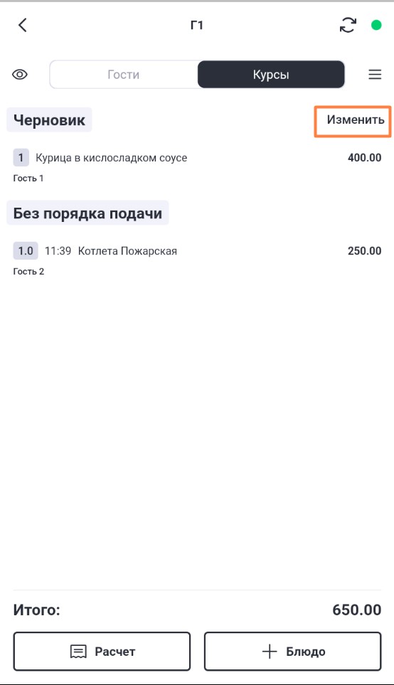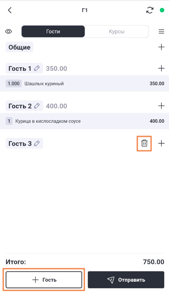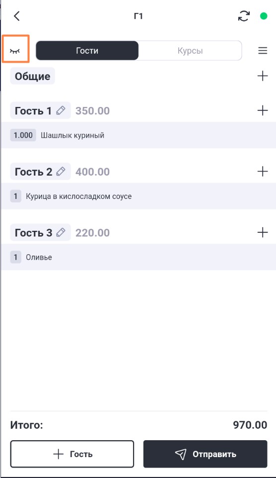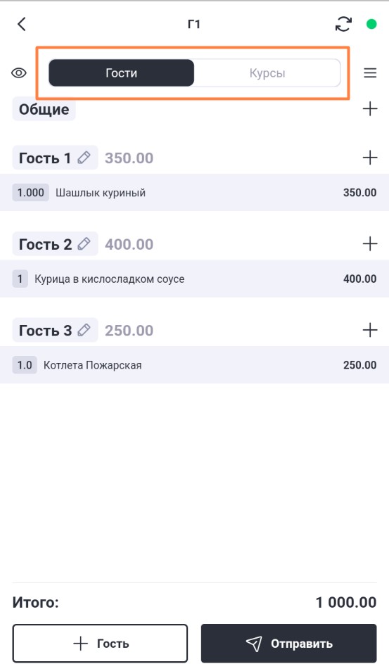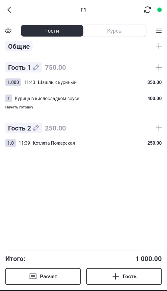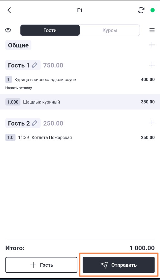После выбора свойств заказа открывается окно заказа. В этом режиме все выбранные блюда можно отсортировать или по Гостям или по Порядкам подачи (курсам). На закладке Гости отображается заказ, распределенный по гостям. Для добавления блюд в заказа используется кнопка "+". Количество гостей будет соответствовать выбранному при создании заказа и и можно изменить: добавить Гостя или удалить последнего в списке. Для удобства можно отключить режим расширенного просмотра. Тогда выбранные модификаторы, порядки подачи и цены будет скрыты на экране. На закладке Курсы отображается заказ, распределенный по порядкам подачи. Здесь можно отправить блюда на готовку или заменить порядок подачи Черновик на другой курс. Для неотправленных блюд будет доступна операция Отправить. Если в заказе все блюда будут отправлены и он не будет содержать отложенных порядков подач, станет доступна операция Расчет.