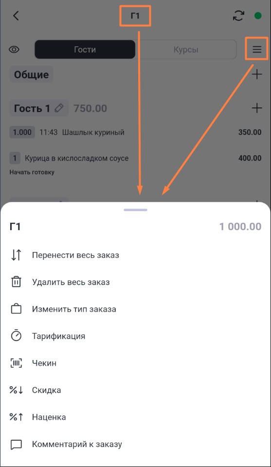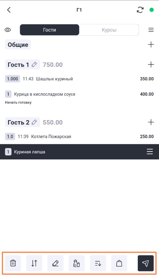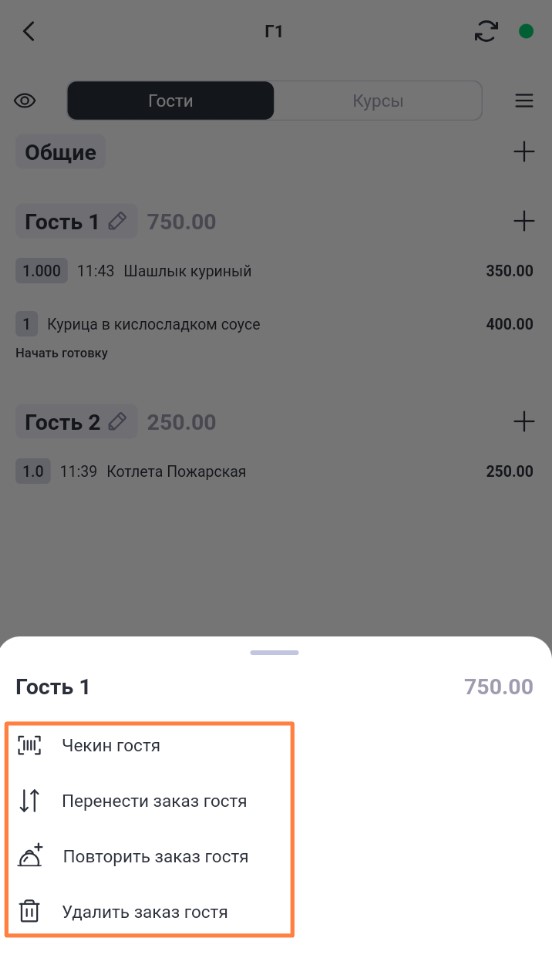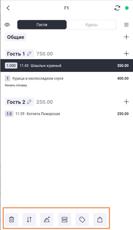 В этом режиме доступны операции с выбранными блюдами, гостями и всем заказом. Чтобы открыть список операций для блюда отметьте его в заказе. Список операций для отправленных и неотправленных блюд разный.