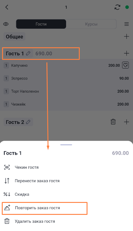 Чтобы повторить заказ одного гостя для другого гостя, в списке операций гостя выберите опцию Повторить заказ гостя.