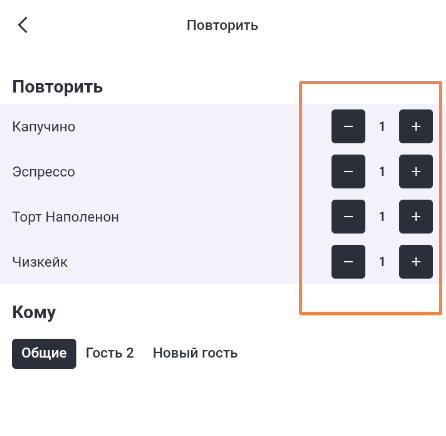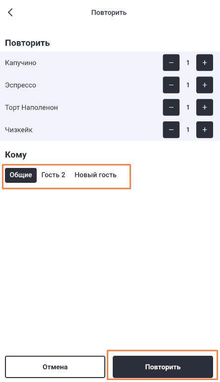 Выберите гостя, которому нужно продублировать заказ, и нажмите Повторить.