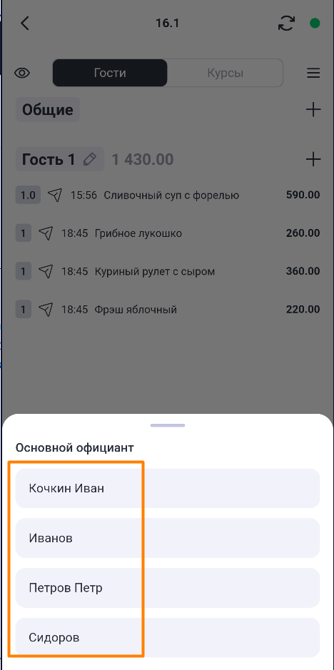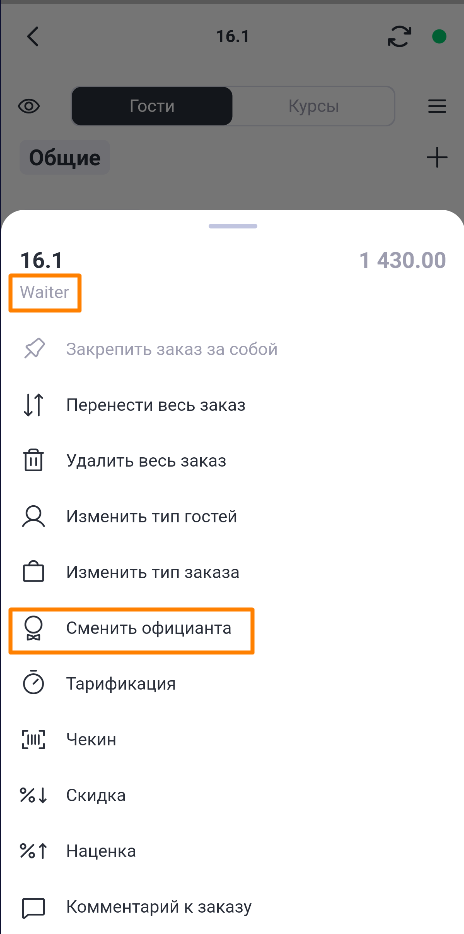 - Поддержана функция замены Основного официанта заказа. В штору со списком операций заказа добавлено имя текущего официанта и операция Сменить официанта. Операция доступна только при включенном праве работника "Задавать основного официанта заказа". В списке для выбора отображаются все официанты, зарегистрированные на кассе. При выборе официанта из списка он станет основным официантом заказа. Если у официанта право "Открывать любой заказ" будет отключено, при смене официанта заказ исчезает из списка его заказов.