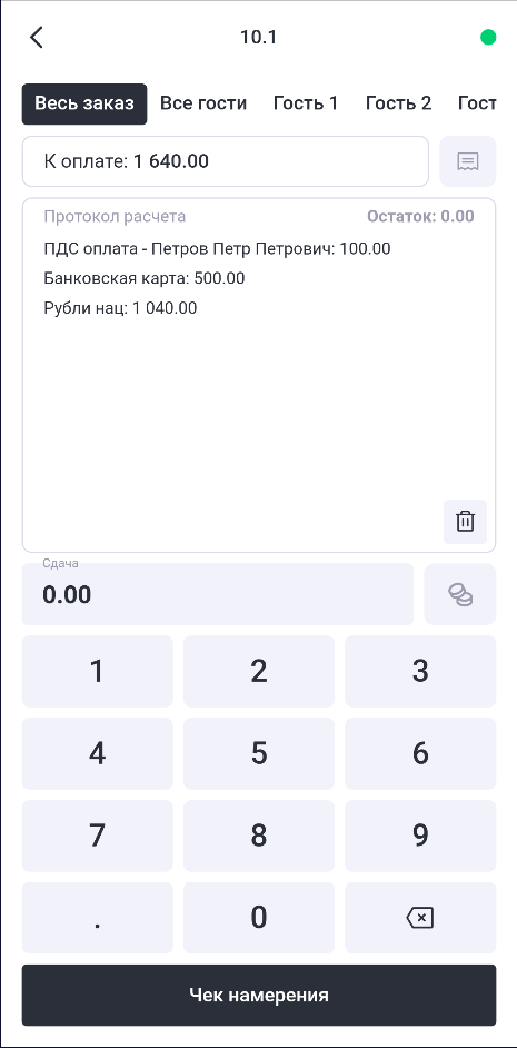 2. После того как введенная сумма станет равной сумме заказа/гостя кнопка Чек намерения активируется. При необходимости можно изменить введенные суммы и валюты, очистив протокол по кнопке "Корзина". Ввести большую сумму, чем требуется к оплате - нельзя. Остаток всегда будет равен нулю.