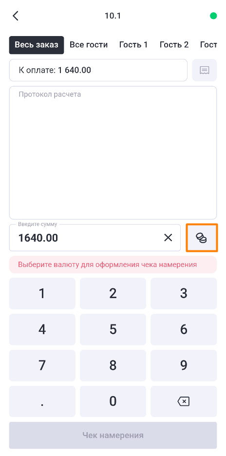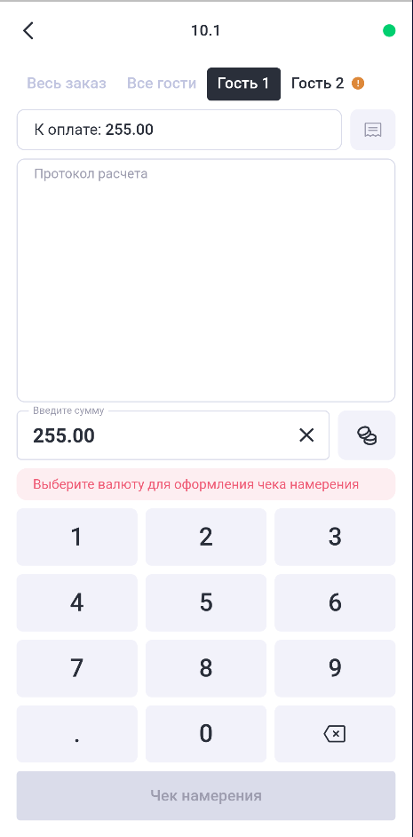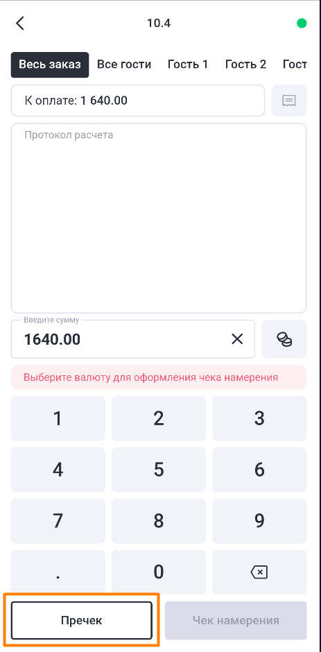 1. В режиме Расчета отображается кнопка Чек намерения и кнопка Пречек (при выключенном параметре "Печатать пречек с чеком намерения"). Предусмотрена печать чека намерения по всему заказу и по гостям. Кнопка "Чек намерения" неактивна до выбора валюты по кнопке