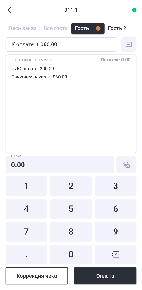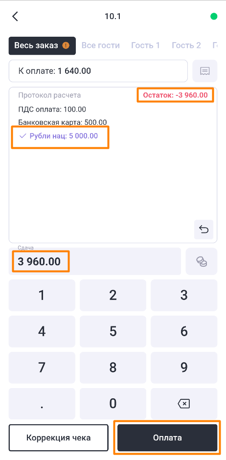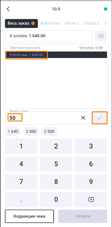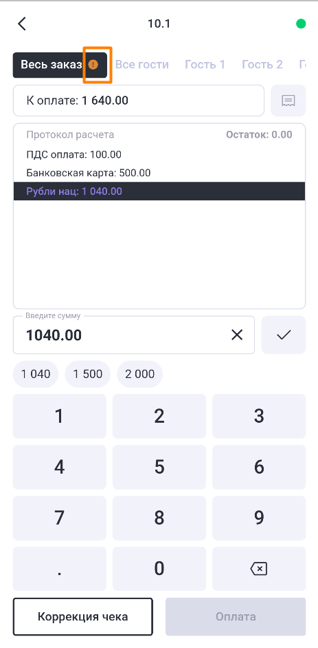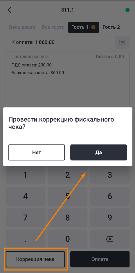 и в режиме расчета станут доступны операции Коррекция чека и Оплата. Редактирование заказа после чека намерения запрещено. В списке заказов такой заказ тоже помечен иконкой.