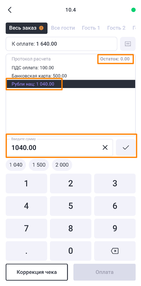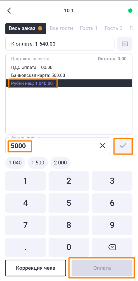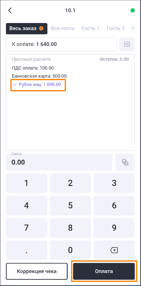 7. После подтверждения суммы рассчитывается сдача. В протоколе автоматически снимается выделение строки с наличными и в начале строки устанавливается "галочка" (признак подтверждения введенной суммы). Активируется кнопка Оплата. При нажатии на нее происходит подтверждение оплаты и заказ закрывается. Если параметр Чек намерения оплаты установлен в значении Чек на расчет в кредит на кассе распечатается чек на оплату кредита.