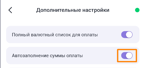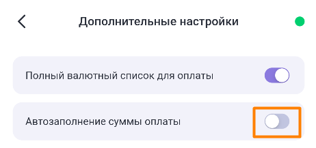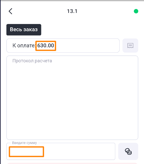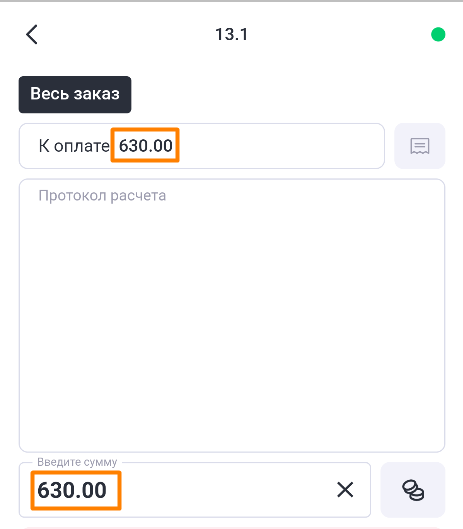 10. Выход из режима Расчета по кнопке "Возврат" отменяет все неподтвержденные действия кнопками Чек намерения, Коррекция чека и Оплата.- Добавлена настройка для автозаполнения суммы при расчете заказа. Теперь при включенной настройке Настройки > Дополнительные настройки > Автозаполнение суммы оплаты (по умолчанию включена) поле для ввода будет заполняться автоматически полной суммой к оплате. При отключенной настройке поле будет пустым.
