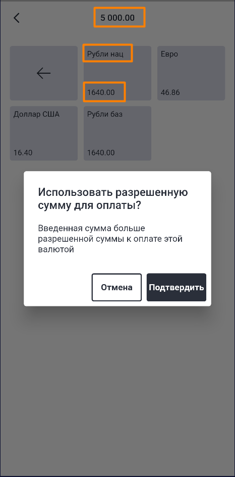 Если введена сумма меньше требуемой, кнопка подтверждения будет неактивной.