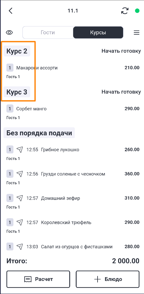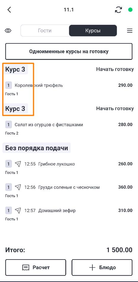 - Вернули объединение блюд без курса в один блок. Теперь на вкладке "Курсы" все блюда без курсов и все отправленные на готовку блюда из разных порядков подачи, отображаются в едином блоке "Без порядка подачи".