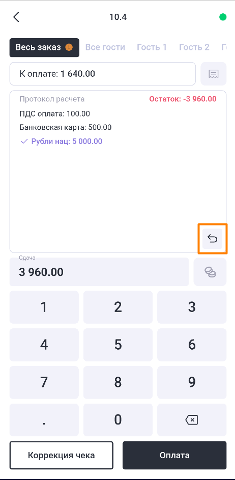 9. По кнопке Коррекция чека формирует электронный кассовый чек коррекции "Возврат прихода" и разблокирует заказ для его редактирования. Активность кнопки определяется правом работника "Коррекция чека намерения" (если право отключено кнопка будет неактивна). После нажатия на Коррекция чека у заказа/гостя снимается признак "Чек намерения" и в заказе можно: удалить блюда, добавить скидку/наценку или изменить валюту для чека намерения. Добавить блюдо нельзя (временное ограничение r_keeper).