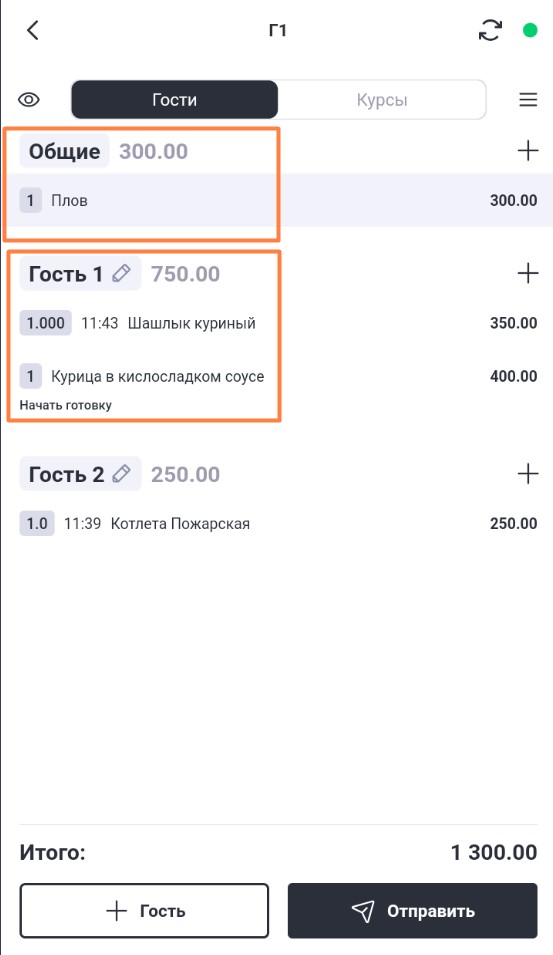 Количество гостей задается в момент создания заказа. Блюда можно добавлять или конкретному гостю или в блок Общие блюда.
