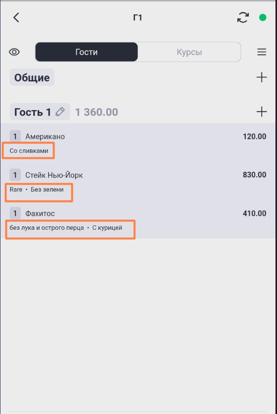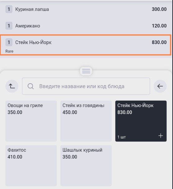 В режиме заказа все выбранные модификаторы будут отображаться в строке под названием блюда.