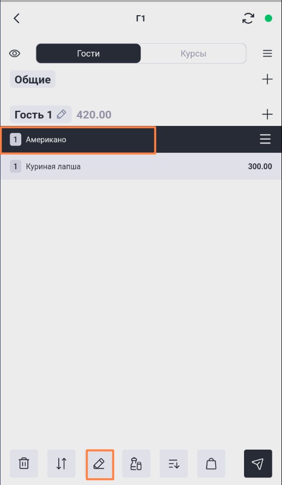 или нажав на добавленное блюдо в области заказа при включенной настройке Заказ на экране меню.
