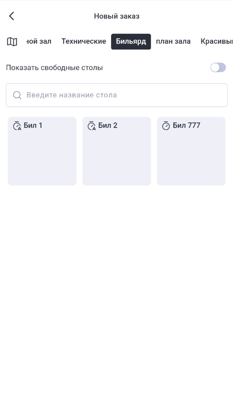- Выберите Зал и тарифицируемое устройство. Тарифицируемые устройства от обычных столов будет отличать иконка секундомера: