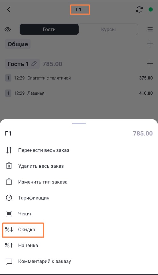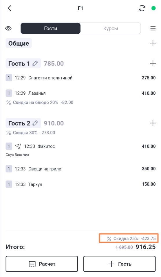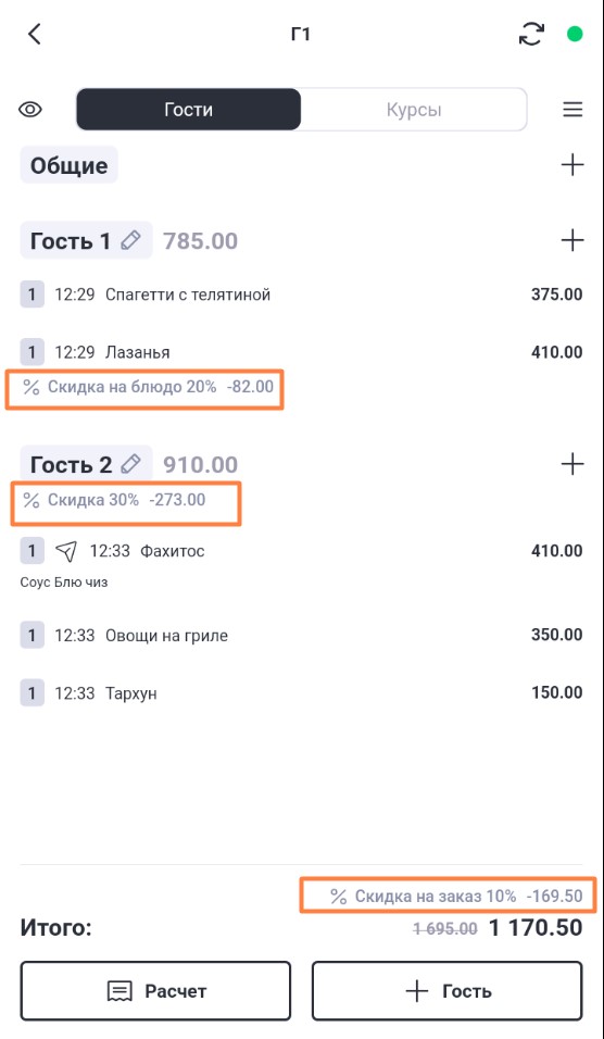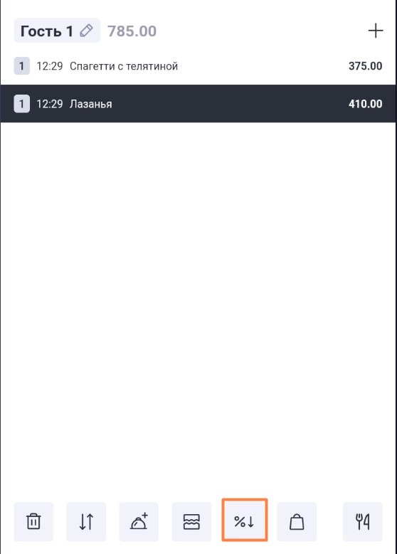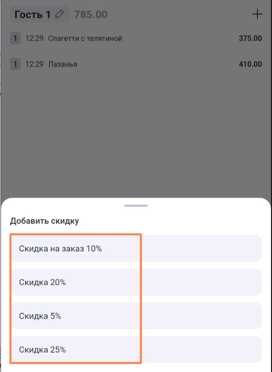 Назначить или удалить скидки в заказ можно в приложении вручную. Поддержана работа со всеми видами скидок: на блюдо, на место и на заказ.