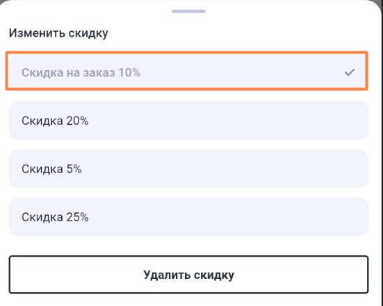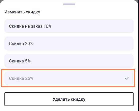 Для удаления добавленной в заказ скидки нажмите на строку с ней. В окне редактирования выбранная скидка будет отмечена галочкой и неактивна для повторного выбора.