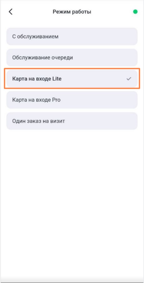 - Карта на входе Lite — в этом режиме нет доступа к редактированию ранее созданных заказов визита. Каждый созданный заказ добавляется в визит и работа с визитами (редактирование и оплата) доступна только на кассовой станции.