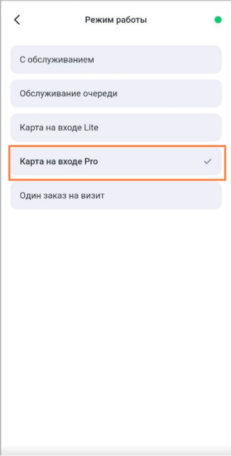 - Карта на входе Pro — в этом режиме доступна стандартная работа со списком заказов визита. Оплата визита доступна только на кассовой станции.